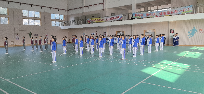 下午 13:30,广播操比赛率先拉开帷幕。华新中学 27 名参赛队员身着统一服装,以标准的队形整齐列队。伴随着组委会统一播放的《舞动青春》背景音乐,队员们精神抖擞、动作规范 —— 抬手伸展利落有力,踢腿弯腰精准到位,转身跳跃整齐划一,领操员正面示范从容自信,充分展现了初中生昂扬向上的精神风貌。从赛前反复打磨动作细节,到赛场之上的全神贯注,每一个节拍的精准衔接,都凝聚着教练徐天乐的悉心指导与队员们的刻苦训练。
