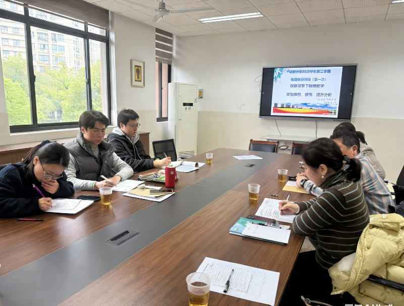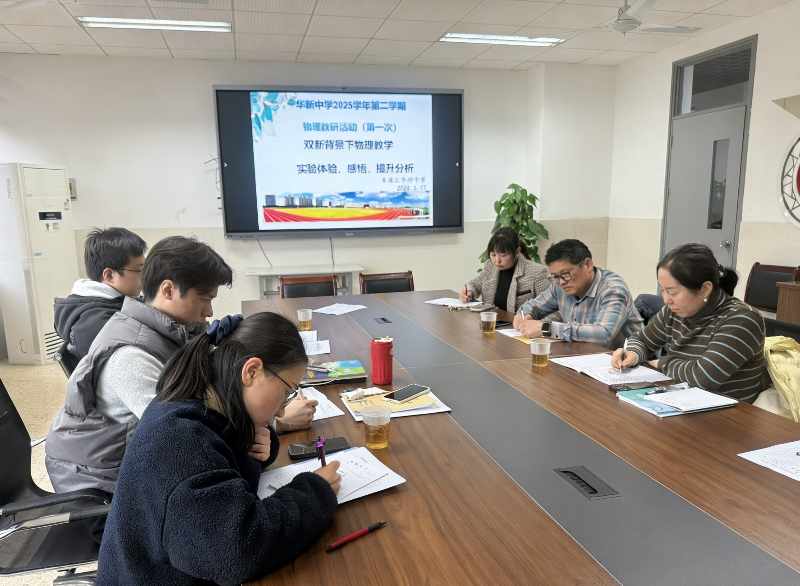 2026年3月17日下午,华新中学物理教研组新学期工作会议在一号楼二楼会议室召开。教研组长尹姗姗老师主持会议并作主题发言,全体物理教师参会。